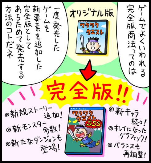 完全版商法はゲーム界隈でよく使われる言葉で、ゲームタイトルを発売した後で、その内容に新規エピソードや新キャラなどの要素を加えた“完全版”を発売することを指します。批判的に用いられることが多いです。