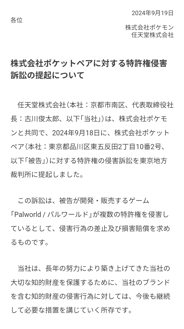 パルワールドはパクリは否定せず法的に問題ないです!って言ってたけど法的に問題あったのかぁ