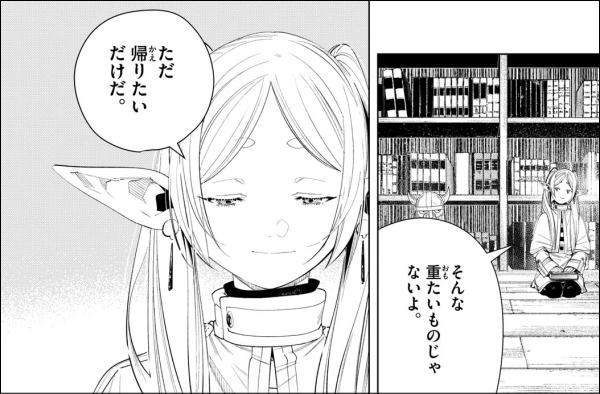 第2話。勇者ヒンメルの葬儀に参列したフリーレンは、自分がヒンメルのことを何も知らなかったことに愕然とし「…人間の寿命は 短いってわかっていた のに…」「…なんでもっと知ろうと思わなかったのだろう…」と言って涙を流し、人間を知るために新たな冒険の旅に出ることを決意する。